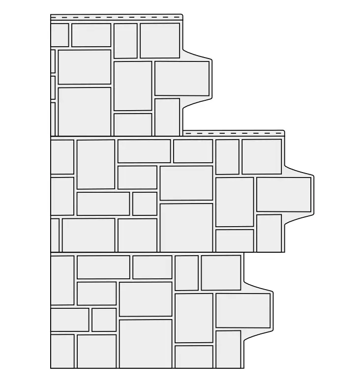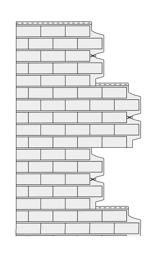 Для минимизации эффекта повторяемости рисунка при монтаже фасадных панелей форм «Состаренный кирпич» и «Клинкерный кирпич», панели необходимо размещать в шахматном порядке (смещение примерно на половину панели). Пример на рисунке.
