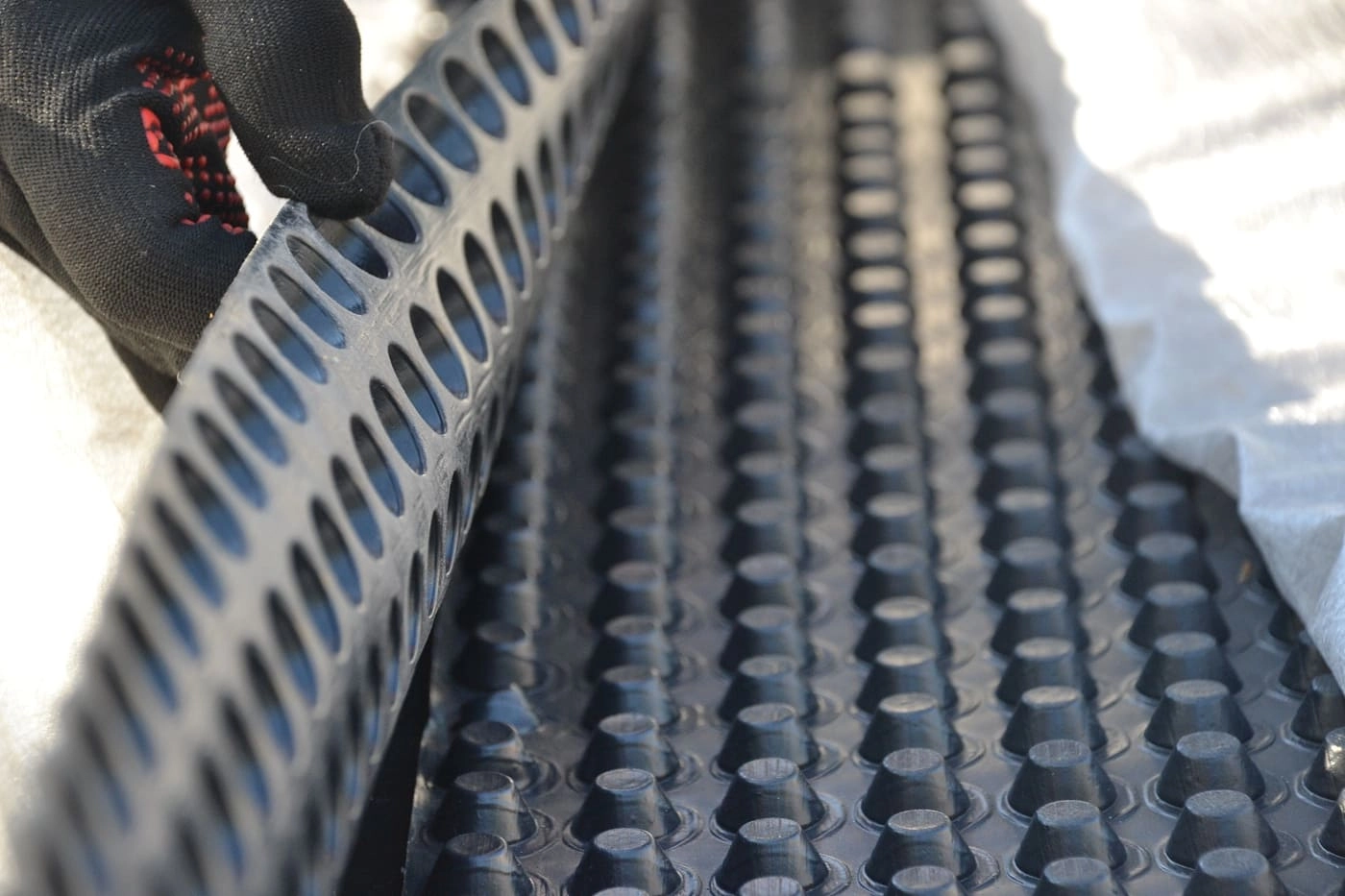 - Уложите мембрану выступами в сторону гидроизоляции, чтобы создать воздушный зазор и обеспечить дренаж.