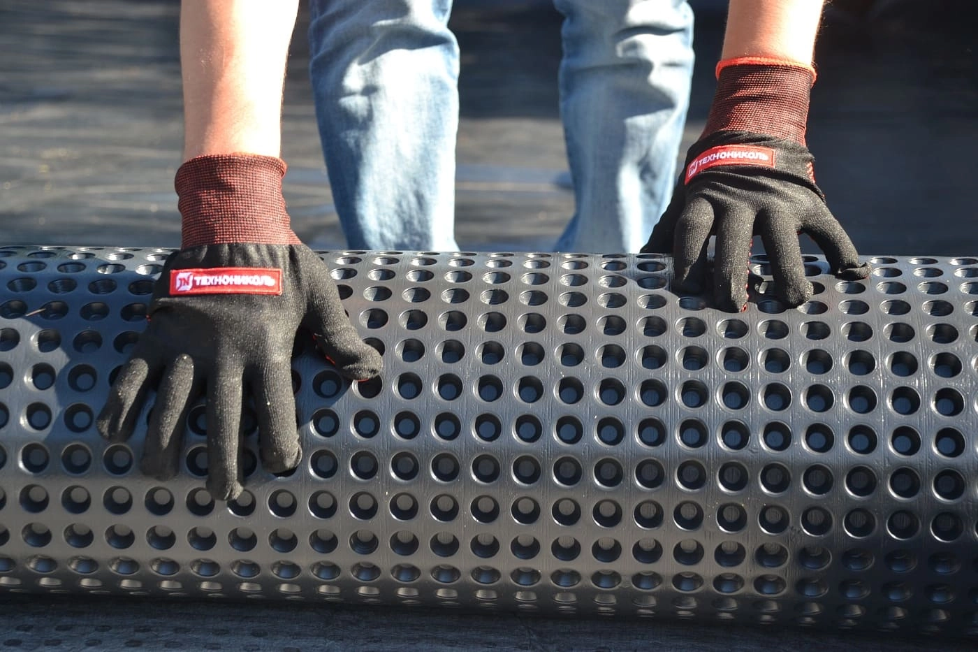 - Уложите мембрану выступами в сторону гидроизоляции, чтобы создать воздушный зазор и обеспечить дренаж.