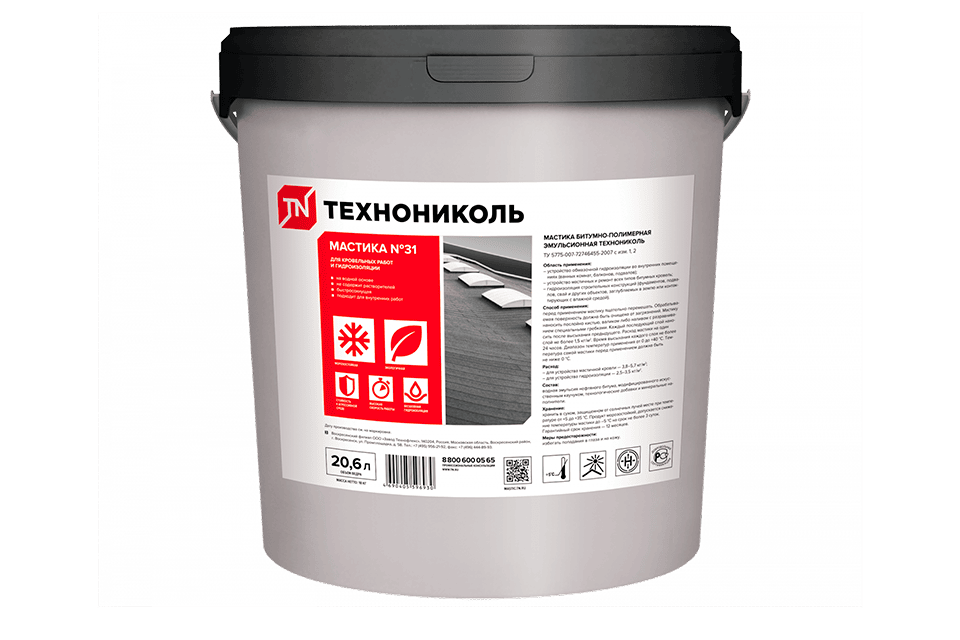 Продукт полностью готов к применению, не имеет неприятного запаха, не выделяет вредных испарений и безопасен для окружающей среды и человека. Эмульсионная мастика ТЕХНОНИКОЛЬ №31 применяется для внутренних и наружных работ.