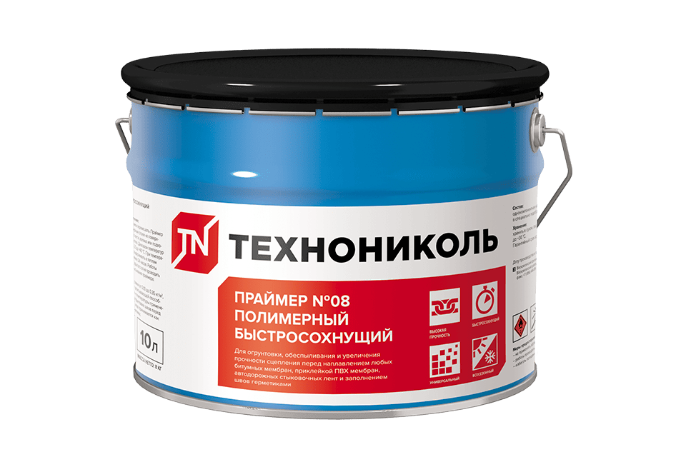 Праймер полимерный ТЕХНОНИКОЛЬ №08 Быстросохнущий — это прозрачный, текучий однородный раствор. Праймер состоит из полимеров и модифицирующих добавок. Благодаря высокой проникающей способности, а также быстрому высыханию, прочно и быстро сцепляется с различными основаниями и материалами.