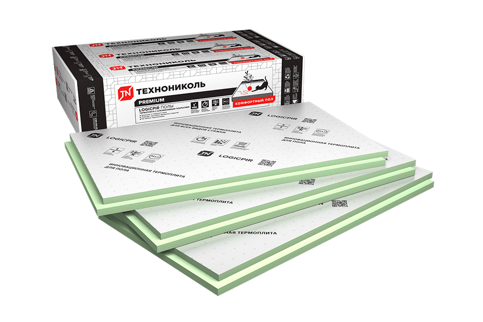 Термоплиты LOGICPIR Полы с двусторонней облицовкой из алюмоламината созданы для эффективной теплоизоляции как обычных, так и теплых полов. Благодаря тому, что материал облицовки надёжно защищен от коррозии, термоплиты можно использовать как с сухой, так и с мокрой стяжкой без использования дополнительных разделительных слоев. Основа LOGICPIR — полиизоцианурат (PIR), материал, который известен своим крайне низким коэффициентом теплопроводности (0,023 Вт/м*К). Эта отличительная черта поможет снизить теплопотери без увеличения толщины теплоизоляционного слоя.