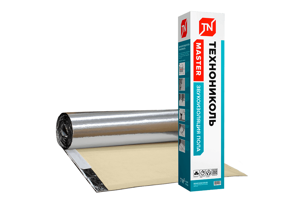 Снижение шума достигает 26 дБ, что соответствует уровню жилья повышенной комфортности. Звукоизоляция пола ТЕХНОНИКОЛЬ производится путем склейки битумным вяжущим металлизированной полиэфирной пленки со звукоизоляционным полотном.
